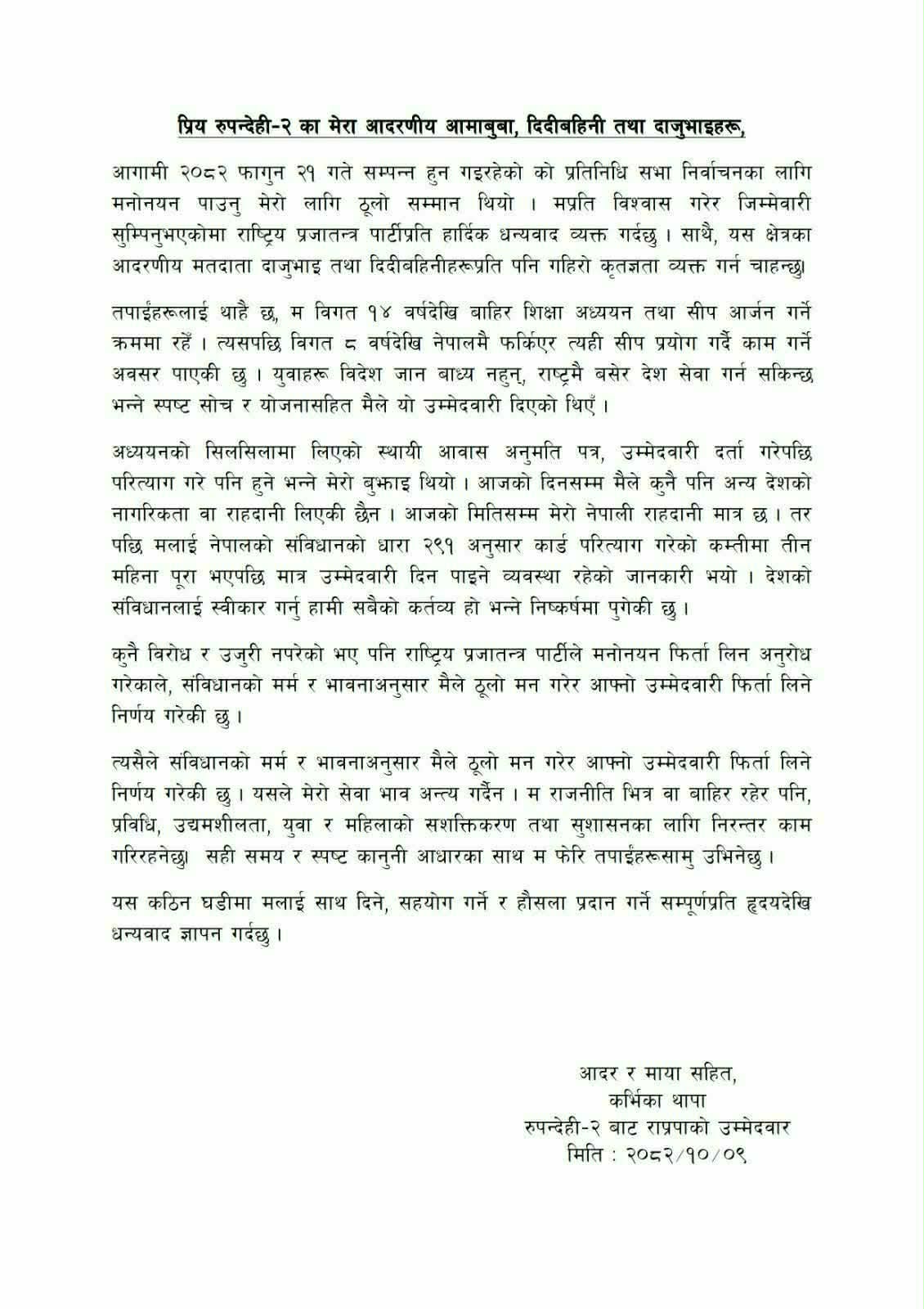 बुटवल । रूपन्देही निर्वाचन क्षेत्र नम्बर २ की राप्रपा उम्मेदवार कर्भिका थापाले उम्मेदवारी फिर्ता लिएकी छन् । कसैले विरोध र उजुरी नगरे पनि पार्टीले भनेपछि उम्मेदवारी फिर्ता लिएको उनले बताइन् । नेपालको संविधानको धारा २९१ अनुसार विदेशमा बस्दा प्राप्त कार्ड परित्याग गरेको तीन महिना पुगेपछि मात्र उम्मेदवारी दिनु पर्नेमा त्यो अवधि नपुग्दै उम्मेदवारी दिएको हुँदा फिर्ता लिएको उनले जारी गरेको विज्ञप्तिमा उल्लेख छ ।