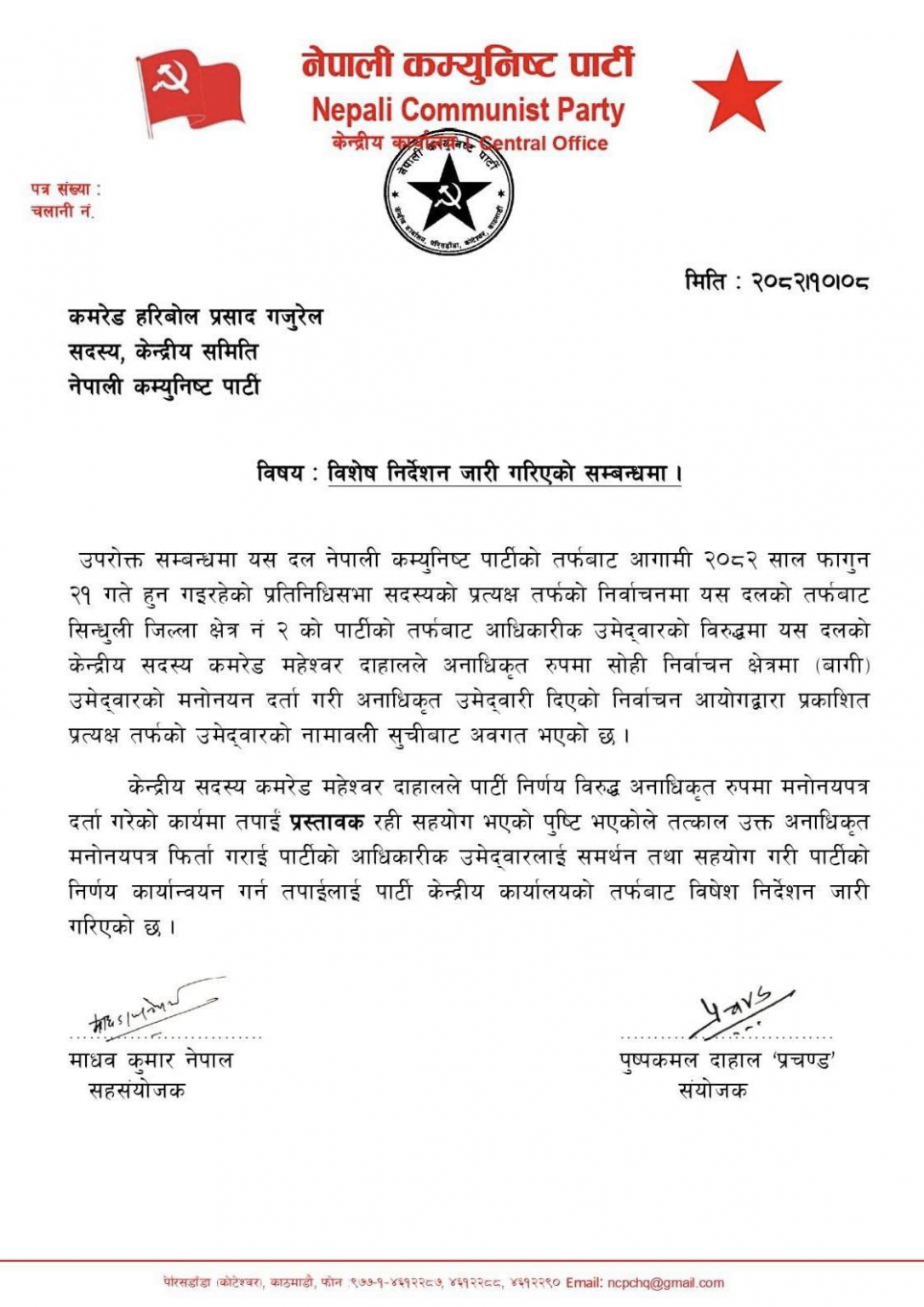 सिन्धुली । सिन्धुली–२ मा नेपाली कम्युनिष्ट पार्टी (नेकपा) भित्रको आन्तरिक विवादले नयाँ मोड लिएको छ । पार्टीले नेता हरिबोल गजुरेललाई बागी उम्मेदवार महेश्वर दाहालको उम्मेदवारी फिर्ता गराउन निर्देशन दिएको भए पनि गजुरेलले निर्देशन अस्वीकार गरेका छन् ।