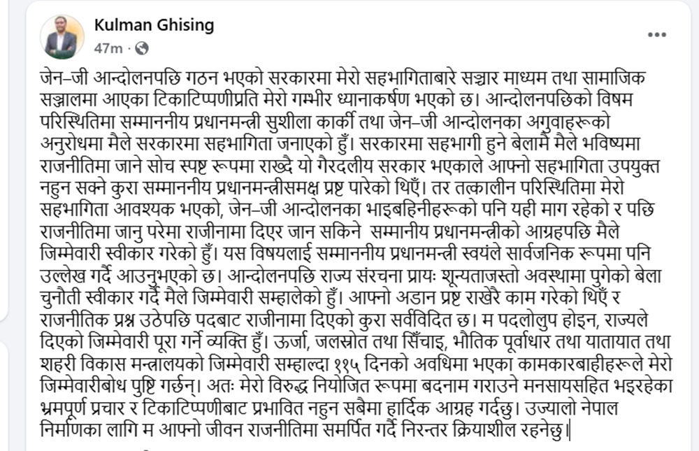 काठमाडौं । उज्यालो नेपाल पार्टी (उनेपा) का अध्यक्ष तथा पूर्वमन्त्री कुलमान घिसिङले गैरदलीय अन्तरिम सरकारमा आफ्नो सहभागिताबारे उठिरहेका आलोचना र टिकाटिप्पणीप्रति धारणा सार्वजनिक गरेका छन् । सञ्चारमाध्यम र सामाजिक सञ्जालमा आफूलाई लक्षित गर्दै फैलाइएका भ्रमपूर्ण टिप्पणीप्रति गम्भीर ध्यानाकर्षण भएको जनाउँदै उनले सामाजिक सञ्जालमार्फत आफ्नो पक्ष राखेका हुन् ।