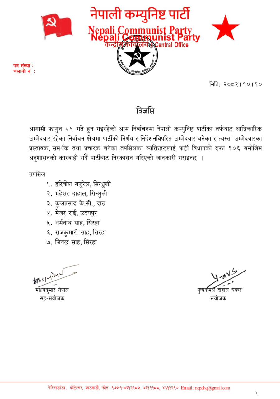 त्यस अवधिमा उम्मेदवारी फिर्ता नभएपछि शनिबार संयोजक प्रचण्ड र सह–संयोजक माधव नेपालले कारबाही गरिएको सूचना जारी गरेका हुन् । दाङमा नेकपाले मेटमणि चौधरीलाई उम्मेदवार बनाएको थियो । त्यसमा असन्तुष्ट पूर्व मुख्यमन्त्री कुलप्रसाद केसीले उम्मेदवारी दिएका थिए । उनलाई पनि शनिबार पार्टीबाट निस्कासश गरेको हो ।