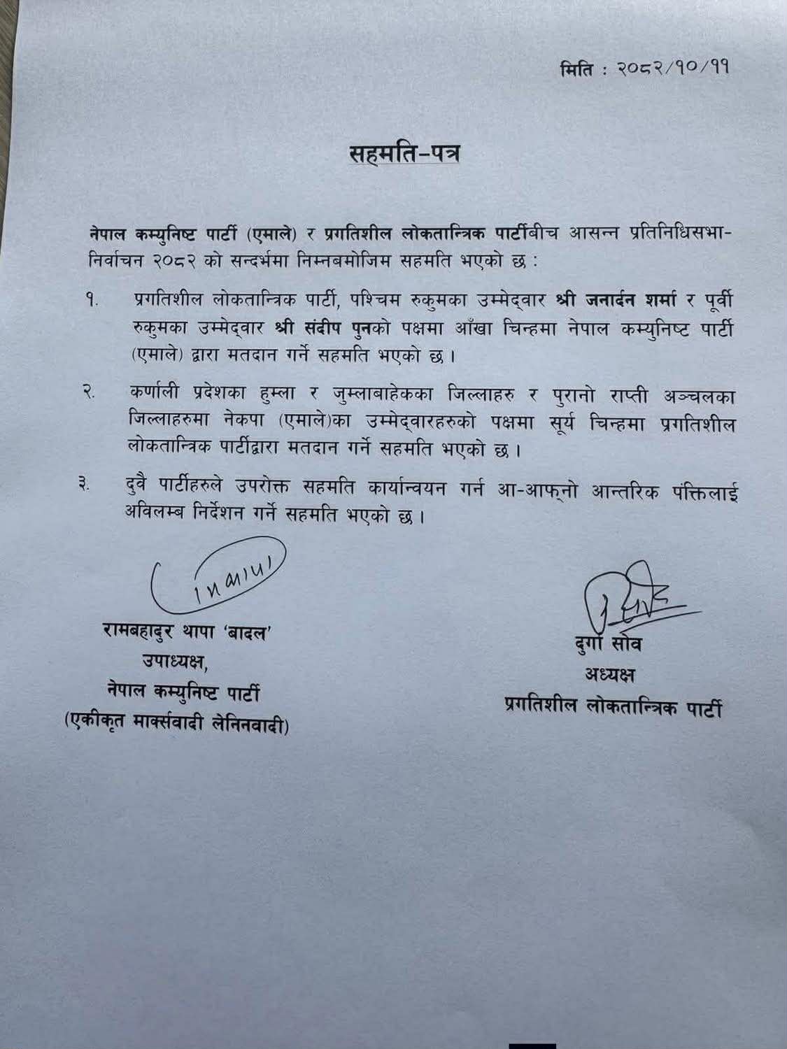 आइतबार काठमाडौँमा भएको कार्यक्रममा एमालेका उपाध्यक्ष रामबहादुर थापा ‘बादल’ र प्रलोपाकी अध्यक्ष परिषद सदस्य दुर्गा सोवले सहमति पत्रमा हस्ताक्षर गरेका छन् । सहमतिअनुसार हुम्ला र जुम्ला बाहेकका कर्णालीका सबै जिल्लामा प्रलोपा एमालेको चुनाव चिह्नमा मतदान गर्न तयार भएको छ ।