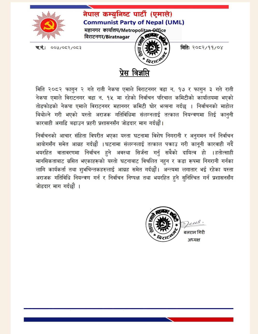 ‘निर्वाचनको माहोल विथोल्ने गरी भएको यस्तो अराजक गतिविधिमा संलग्नलाई तत्काल नियन्त्रणमा लिइ कानुनी कारबाही अघि बढाउन प्रहरी प्रशासनसँग जोडदार माग गर्दछौं,’ गिरीद्वारा जारी विज्ञप्तिमा भनिएको छ ।