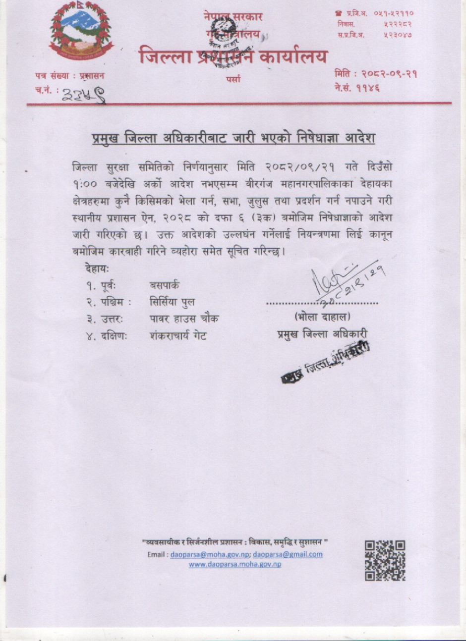 वीरगञ्जमा निषेधाज्ञा आदेश जारी, उल्लङ्घन गर्नेलाई कारबाही चेतावनी