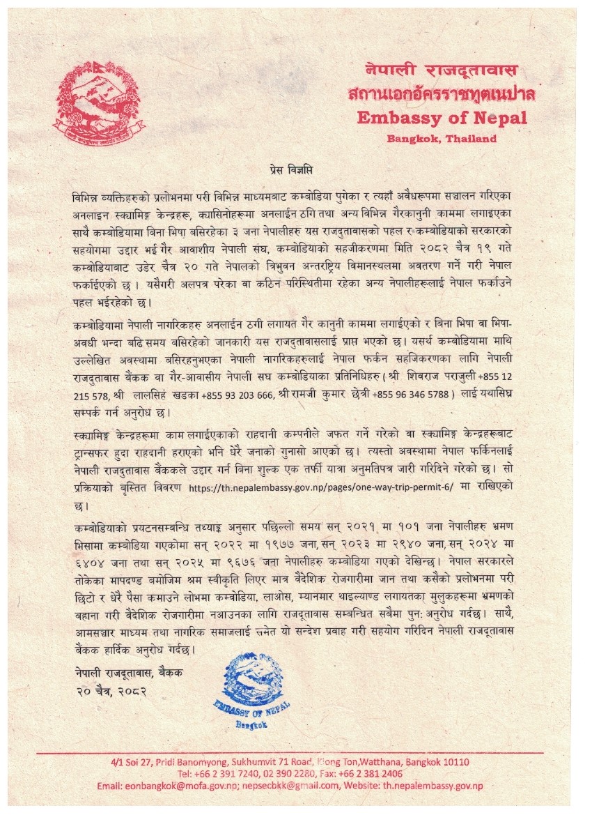 दूतावासले अलपत्र तथा कठिन परिस्थितिमा परेका अन्य नेपालीलाई पनि नेपाल फर्काउने प्रयास जारी रहेको जनाएको छ। कम्बोडियामा रहेका नेपाली नागरिकलाई अनलाइन ठगी, गैरकानुनी काममा लगाइएका वा भिसा अवधि नाघेर बसिरहेको अवस्थाबारे जानकारी प्राप्त भएको छ। यस अवस्थामा रहेका नेपालीहरूले शीघ्र नेपाली राजदूतावास बैंकक वा कम्बोडियासँग सम्पर्क गर्नुपर्ने दूतावासले आग्रह गरेको छ।