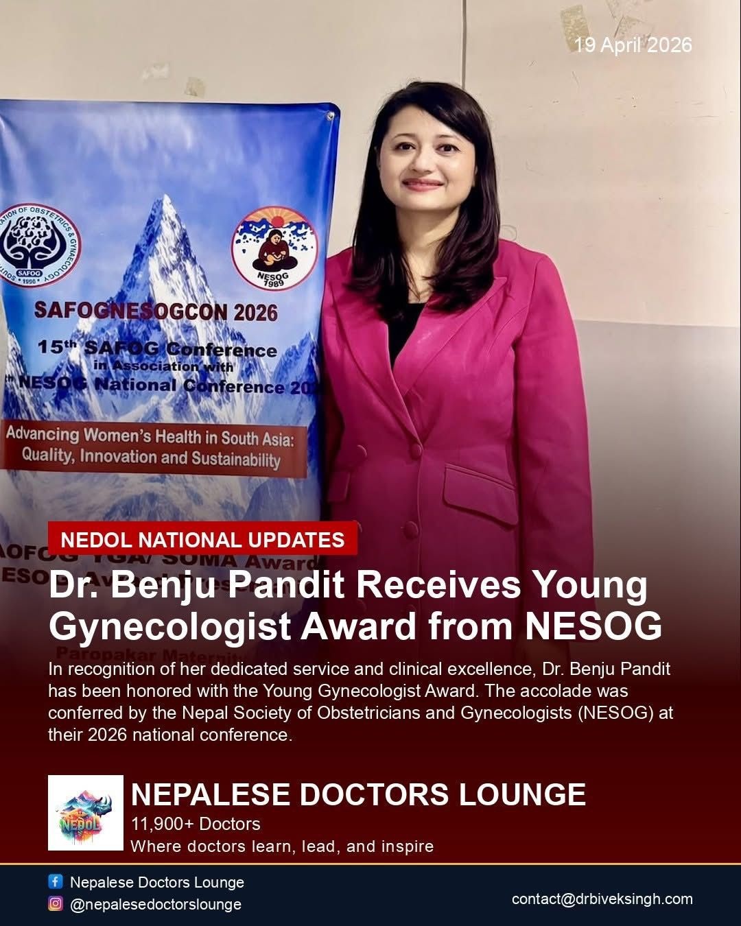 नेसाेगले उनलाई प्रदान गरेको यो अवार्ड युवा चिकित्सकहरूका लागि प्रेरणादायी उपलब्धि भन्दै सराहना गरेको छ।