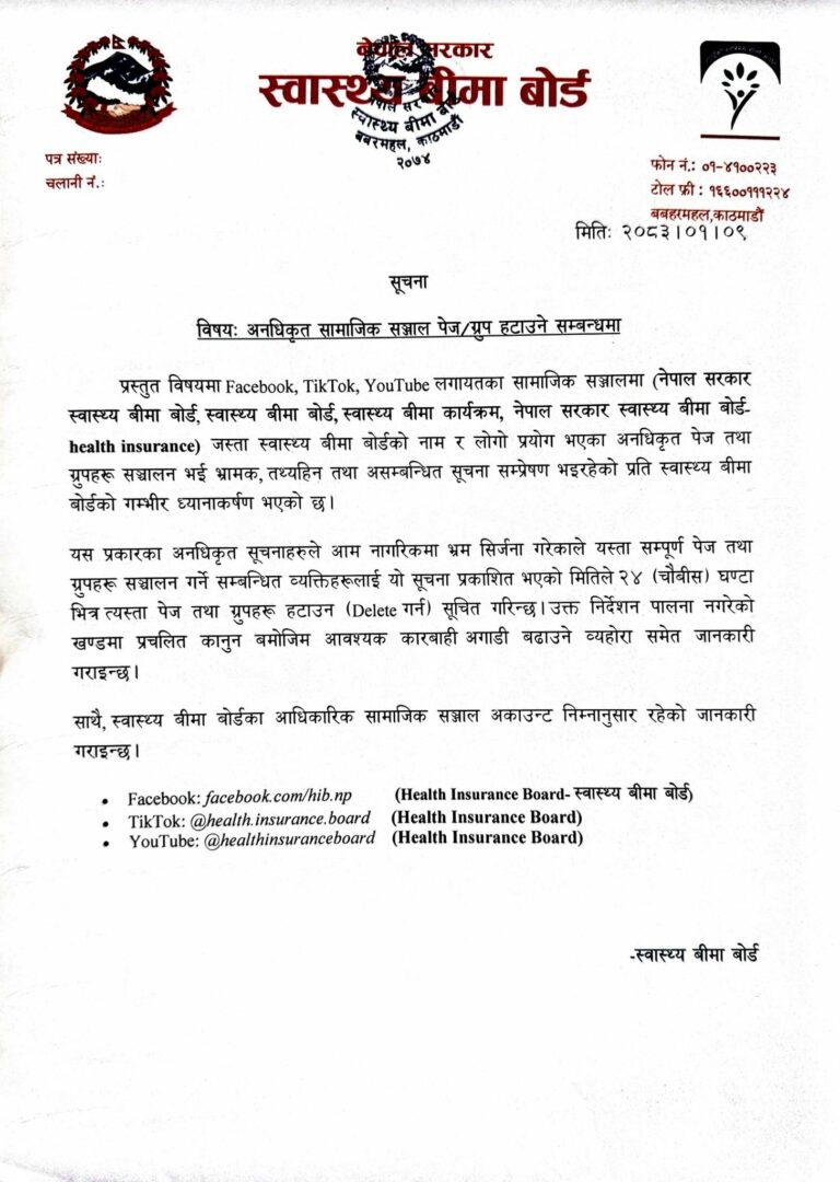 काठमाडौं। स्वास्थ्य बीमा बोर्ड ले आफ्नो नाम र लोगो दुरुपयोग गरी सामाजिक सञ्जालमा सञ्चालन भइरहेका अनधिकृत पेज तथा समूहप्रति ध्यानाकर्षण भएको जनाएको छ।