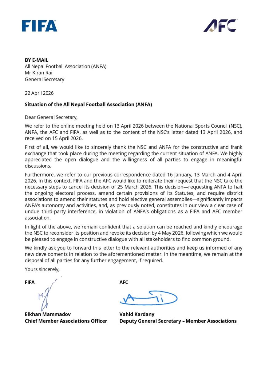 फिफा र एएफसीले संयुक्त रूपमा पत्राचार गर्दै उक्त आग्रह गरेका हुन् ।