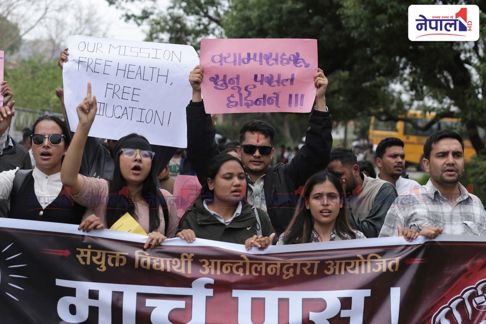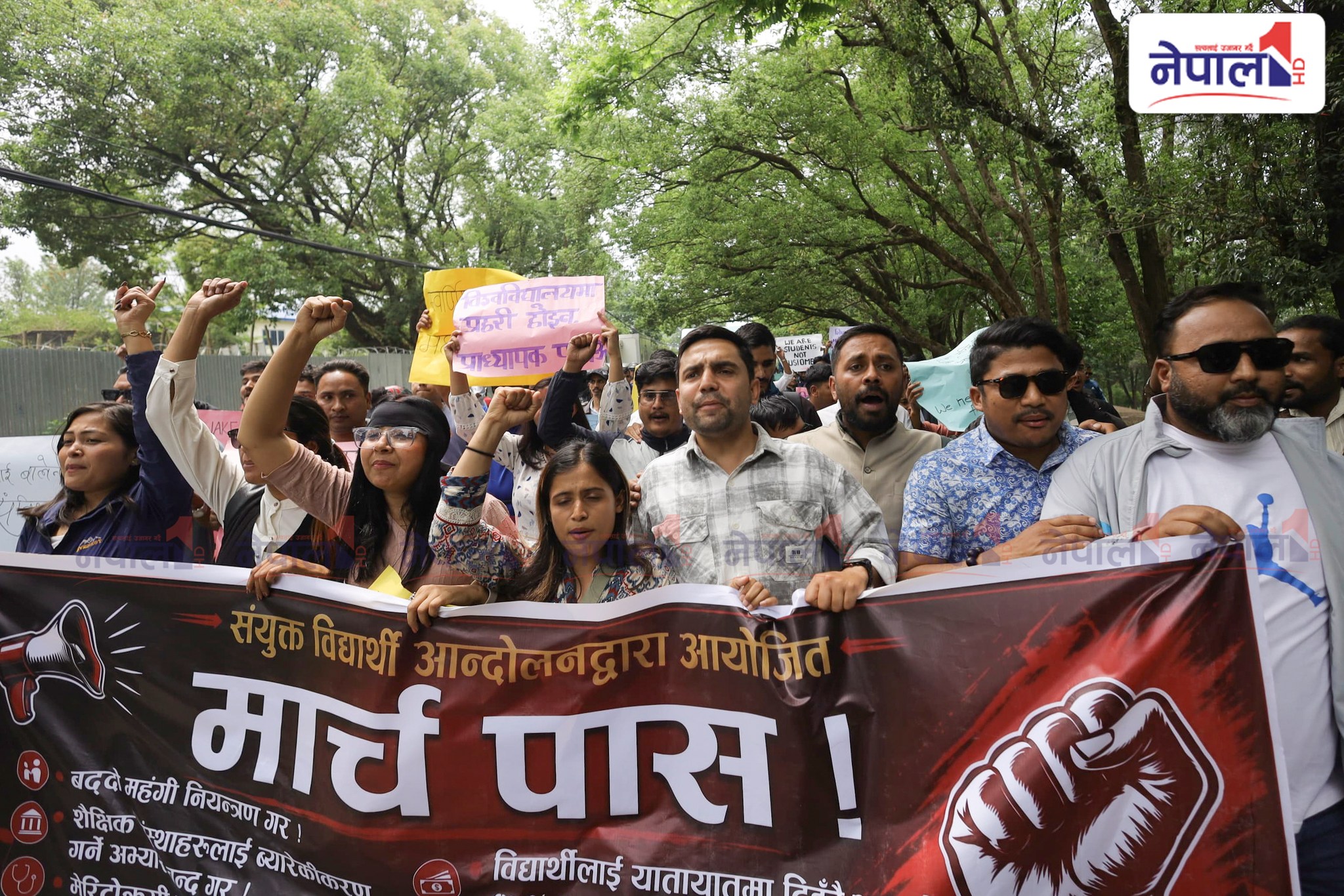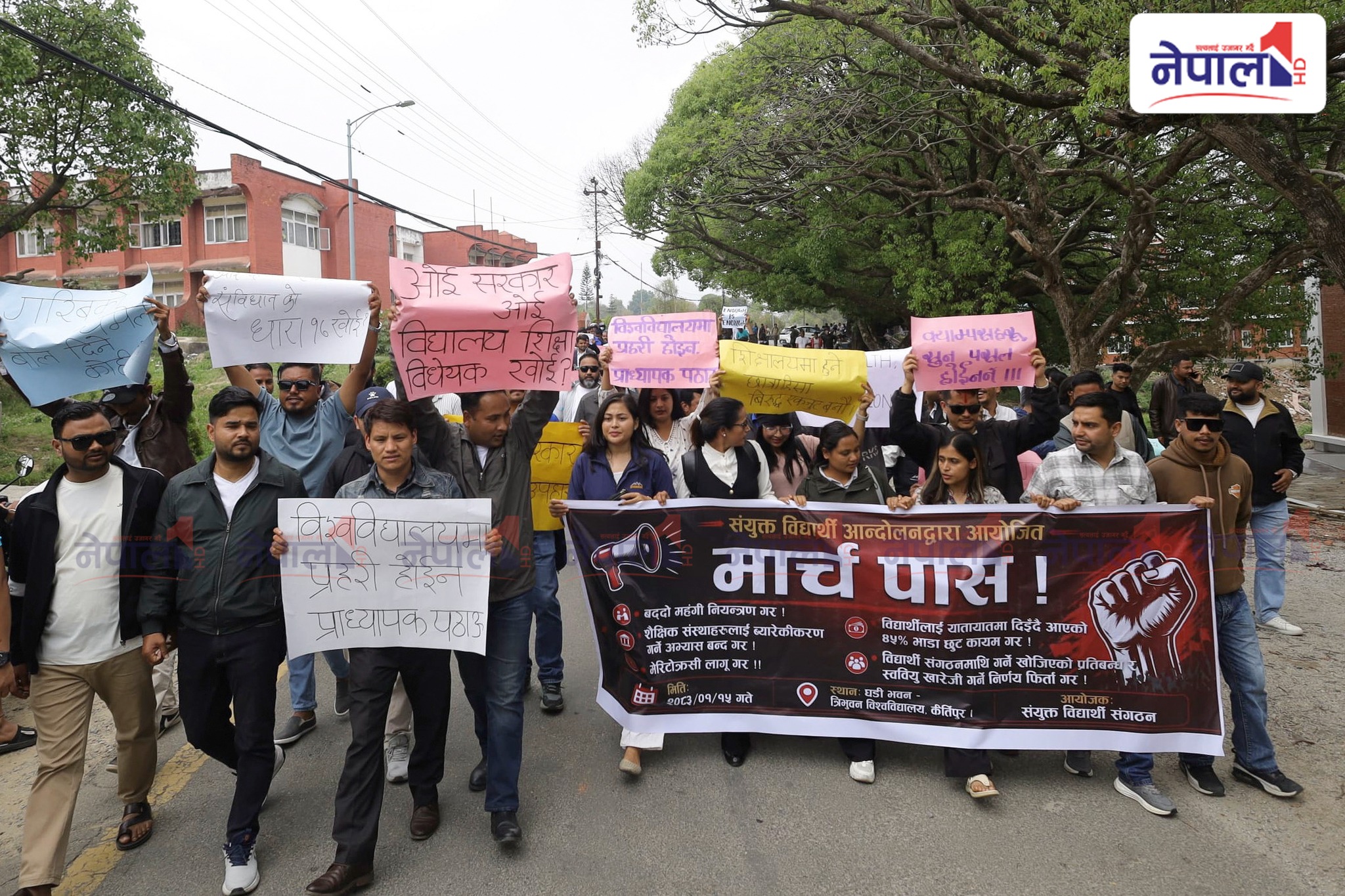 काठमाडौं ।  सरकारको विद्यार्थी संगठन खारेज गर्ने निर्णय अघि बढाएपछि संयुक्त विद्यार्थी संगठनले त्रिवि परिसरमा विरोधस्वरूप मार्चपास गरेको छन् ।