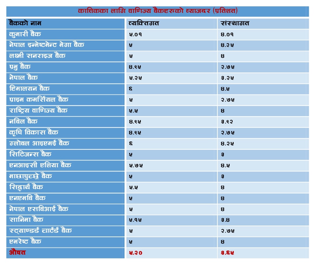 काठमाडौं । वाणिज्य बैंकहरुले कात्तिक महिनाका लागि नयाँ ब्याजदर सार्वजनिक गरेका छन् । असोजको तुलनामा वाणिज्य बैंकहरुको औषत ब्याजदर घटेको छ । बैंकहरुले सार्वजनिक गरेको नयाँ ब्याजदर अनुसार व्यक्तिगत मुद्दती निक्षेपको अधिकतम ब्याजदर औषतमा ५.२० प्रतिशत विन्दुमा झरेको छ । जबकी यस्तो ब्याजदर असोज महिनामा ५.४६ प्रतिशत विन्दु थियो ।