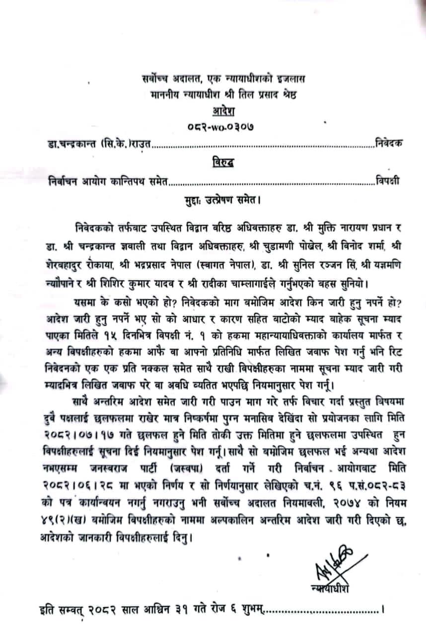 न्यायाधीश श्रेष्ठले विपक्षीका नाममा लिखित जवाफ माग्दै आगामी कार्तिक १७ गते छलफल हुने मिति तोकेका छन् । त्यस छलफल सम्पन्न नभएसम्म आयोगको निर्णय कार्यान्वयन नगर्न सर्वोच्चले आदेश दिएको हो । ‘आदेश नभएसम्म जनस्वराज पार्टी (जस्वपा) दर्ता गर्ने गरी निर्वाचन आयोगबाट २०८२ असोज २८ मा भएको निर्णय र सो निर्णयानुसार लेखिएको च.नं .९६ प.सं.०८२–८३ को पत्र कार्यान्वयन नगर्नु नगराउनु भनी सर्वोच्च अदालत नियमावली, २०७४ को नियम ४९(२) (ख) बमोजिम विपक्षीहरूको नाममा अल्पकालीन अन्तरिम आदेश जारी गरी दिएको छ,’ आदेशमा उल्लेख छ ।