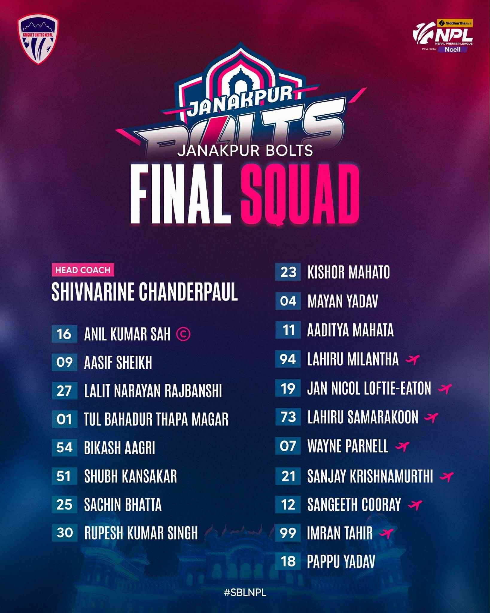 यस्तै पहिलो संस्करणमा नेपाली राष्ट्रिय टोलीका पूर्व प्रशिक्षकसमेत रहेका पुबुदु दासानायकेको नेतृत्वमा रहेको जनकपुर यस संस्करणमा वेस्ट इन्डिजका शिवनारायण चन्द्रपालको प्रशिक्षणमा मैदानमा उत्रिंदैछ । दक्षिण अफ्रिकाका भेट्रान स्पिनर इमरान ताहिर र वायने पार्नेल जनकपुरले प्रतियोगिताका निम्ति भित्र्याएका चर्चित नाम हुन् । यी दुवैले अन्तर्राष्ट्रिय क्रिकेटमा दक्षिण अफ्रिकाको प्रतिनिधित्व गरिसकेका छन् । यस्तै, पहिलो संस्करणको उद्घाटन र फाइनल खेलमा अर्धशतक बनाएका लाहिरु मिलान्थालाई जनकपुरले यसपटक पनि निरन्तरता दिएको छ ।