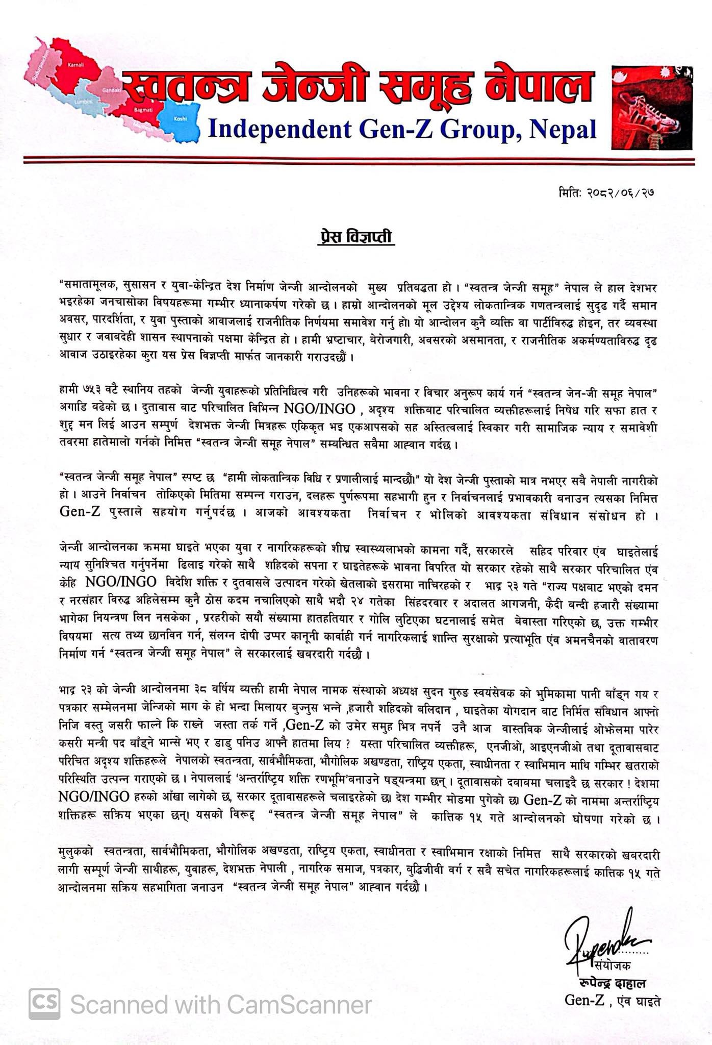 उनले भने, ‘अहिले हाम्रो मुख्य मुद्दा भनेको युनाइटेड हुनु हो । म इलामको एउटा जेनजी आज यहाँ छु । किनभने हामी युनाइटेड हुन चाहन्छौं । कसैले पनि हामी जेन–जीहरुलाई छुट्याउने प्रयास नगरोस् । हामी एक हुन चाहन्छौं । सरकार र मिडियाले गलत म्यासेज पठाएर हामीलाई छुट्याउने काम नगरोस् । अहिले हामी छिन्नभिन्न हुने होइन । हामी सबै जेनजी पुस्ता एक भएर अगाडि बढ्ने दिन आएको छ ।’ नेपाली झण्डा शरीरमा ओढेर शान्तिपूर्ण प्रदर्शन गरिरहेका उनीहरुले जेन–जी समूहलाई एकतावद्ध गर्न सरकारले समेत सहयोग गर्नुपर्ने माग राखेका छन् । —न्युज एजेन्सी नेपाल