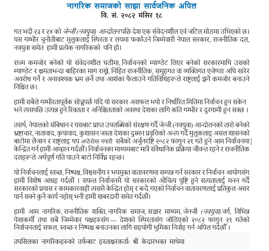 अपिलका हस्ताक्षरकर्तामा केदारभक्त माथेमा, अर्चना थापा, इन्द्र-इन्द्रा अधिकारी, उद्धव प्याकुरेल, कनकमणि दीक्षित, कृष्ण खनाल, कृष्ण पोखरेल, खगेन्द्र संग्रौला, गजाधर सुनार, गेजा शर्मा वाग्ले, चन्द्रकिशोर, चरण प्रसाई, जेबी विश्वकर्मा, तुलानारायण साह, दीपेन्द्र झा, दोभान राई, भोजराज पोखरेल, प्रदीप खतिवडा, महेश मास्के, राजेन्द्र दाहाल, स्टेला तामाङ, सूर्य ढुंगेल, सुवोधराज प्याकुरेल, सुशील प्याकुरेल, हरि शर्मा, विजयकान्त कर्ण, विजय तिमिल्सिना, विद्याधर मल्लिक र वीरेन्द्रप्रसाद मिश्र लगायत छन् । उनीहरूले सबै राजनीतिक शक्ति, जेन–जी, सञ्चार माध्यम, पेसागत समूह र आम नागरिकसमक्ष स्थिरता, शान्ति र संविधानको निरन्तरताका लागि आगामी निर्वाचनमा सहयोगी भूमिका खेल्न एकै स्वरमा अपिल गरेका छन् ।