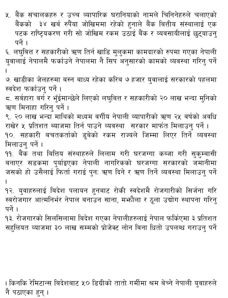 सम्झौता पत्रमा राष्ट्र, धर्म र नागरिक सुरक्षाको सम्मान गर्दै कुनै पनि विभाजनकारी वा हिंसात्मक कार्य नगर्ने उल्लेख छ । सहमति अनुसार आगामी मंसिर ६ गतेदेखि सुरु हुने भनिएको देशव्यापी आन्दोलन र जनजागरण अभियानमा नेपाली कांग्रेस (बीपी) का नेता, कार्यकर्ता तथा समर्थकहरू सक्रिय रूपमा सहभागी हुने छन् ।