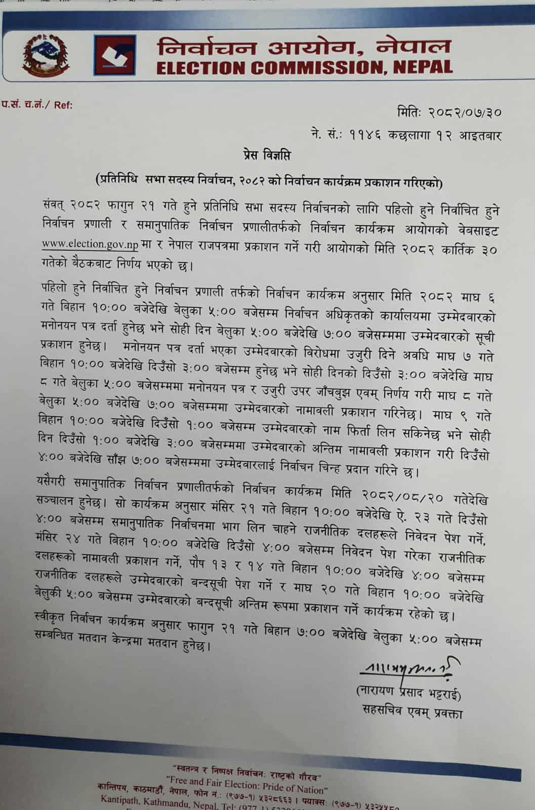 निर्वाचन प्रयोजनका लागि आयोगले कात्तिक २८ गते सूचना प्रकाशन गर्नेछ । त्यसपछि पुराना र नयाँ दुवै दलले पुनः निर्वाचन प्रयोजनका लागि दर्ता निवेदन दिनुपर्नेछ । यसका लागि आयोगले मंसिर १ देखि १० गतेसम्म १० दिनको अवधि दिने तयारी गरेको छ । यसरी दर्ता भएका दलहरूले मात्र समानुपातिक प्रणाली तर्फको निर्वाचनका लागि भाग लिन पाउने छन् ।