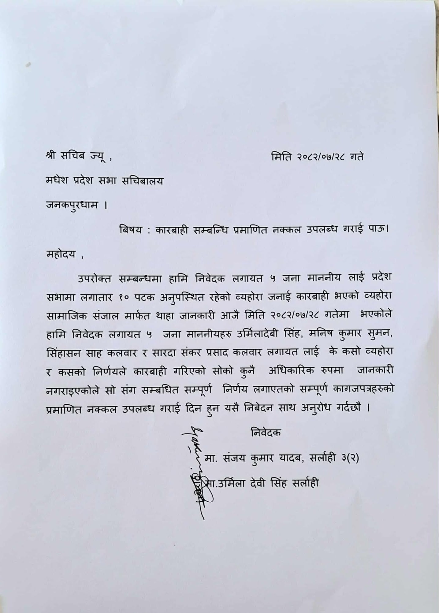 मधेश प्रदेशसभामा कुल १०७ सांसद छन् । तीन जना निलम्बित भएपछि हाल सक्रिय संख्या १०४ छ । बहुमतका लागि ५४ मत आवश्यक भए पनि एमालेसँग सभामुखसहित २५ मात्र सदस्य छन् ।