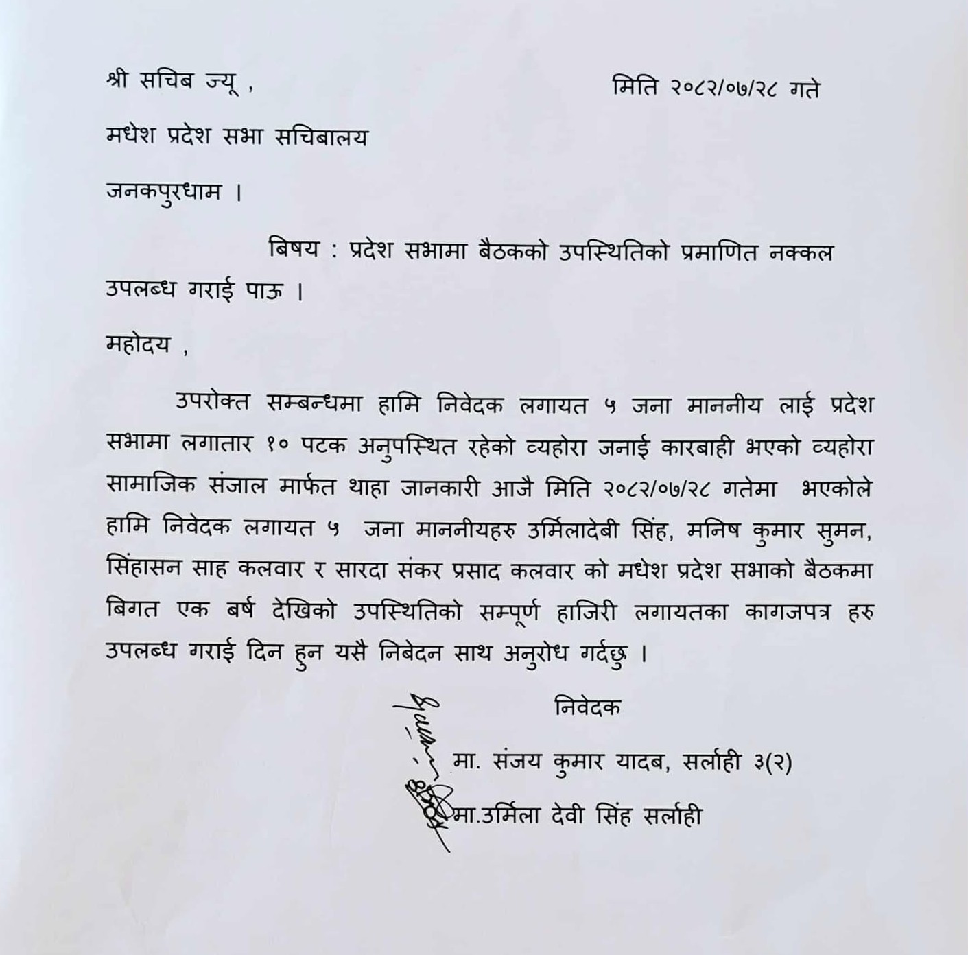 प्रदेशसभाका सभामुख रामचन्द्र मण्डल (एमाले) माथि पनि सात दलको आन्दोलन केन्द्रित हुँदैछ । नव नियुक्त मुख्यमन्त्री सरोज यादव अझै पनि सरकारी निवास प्रवेश गर्न नसकेको र निवर्तमान मुख्यमन्त्री जितेन्द्र प्रसाद सोनार (सोनल) ले निवास कब्जा गरिरहेको समाचार आएको छ । विश्लेषकहरू भन्छन्, ‘मधेशमा अहिले ‘संविधान बनाम सत्ता’ को संघर्ष चलेको छ । होटलमा शपथ लिएको सरकार नै असंवैधानिक प्रक्रियाको प्रतीक बनेको छ ।’ काठमाडौँमा एकीकृत वामपन्थी मोर्चाको चर्चा भइरहँदा मधेशमा भने सत्ता र अस्तित्वको लडाइँ उग्र बन्दै गएको छ । सत्ता समीकरण हरेक घण्टामा बदलिँदैछ । सर्वोच्चको आदेशपछि मुख्यमन्त्री यादवको भविष्य निर्धारण हुनेछ । प्रदेश प्रमुख विवाद, सभामुखविरुद्ध आन्दोलन र दलहरूको एकीकरण–विभाजनबीच मधेश प्रदेश अहिले साँचो अर्थमा ‘राजनीतिक आपतकाल’ मा प्रवेश गरेको देखिन्छ ।