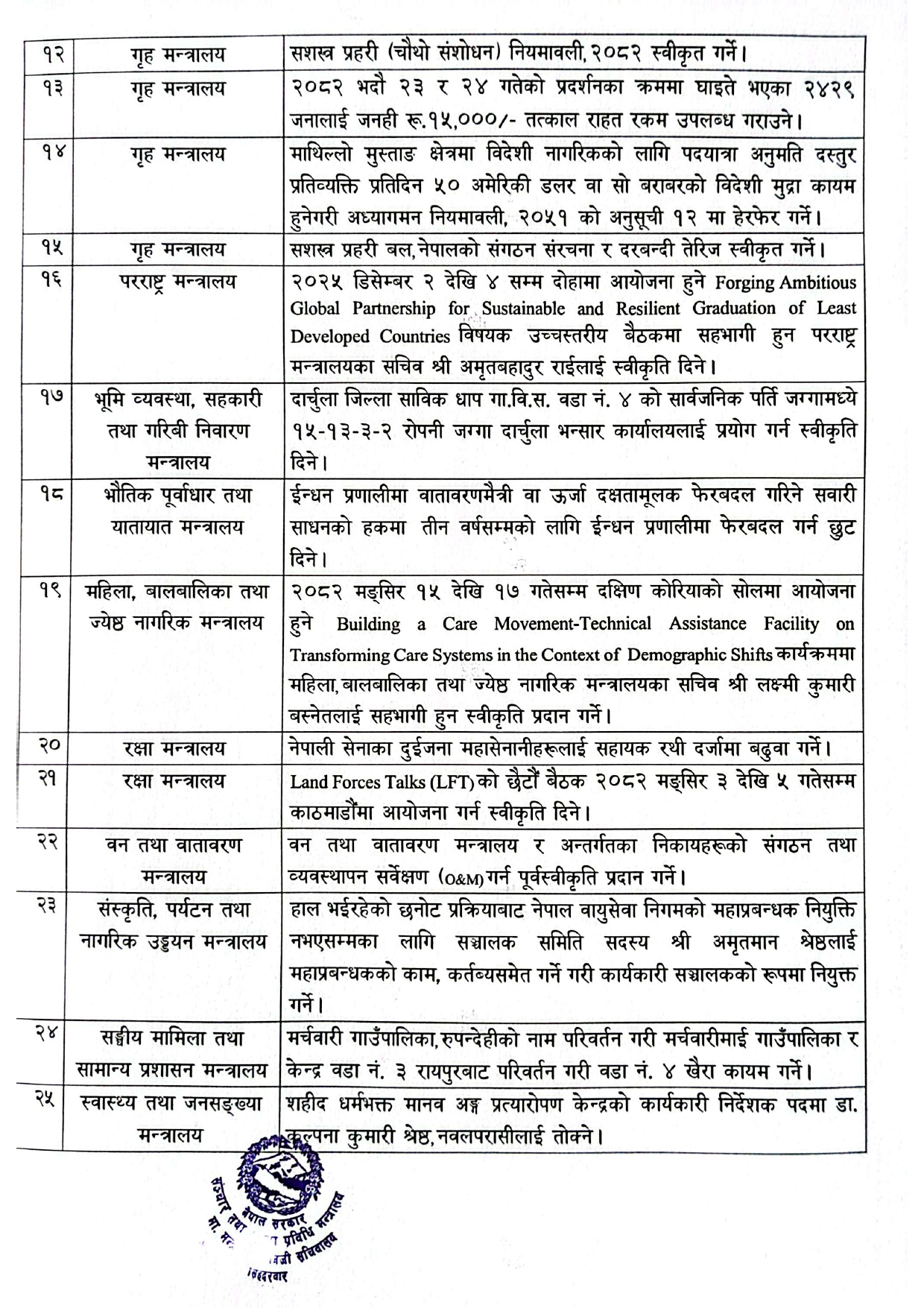 –मित्र राष्ट्रहरू चीन, जर्मनी, इजरायल, मलेसिया, कतार, रुस, साउदी अरब, स्पेन, संयुक्त अधिराज्य, संयुक्त राज्य अमेरिका र जापानका लागि नेपाली आवासीय राजदूतको रुपमा कार्यरत नेपाली राजदूतहरुलाई सो पदको जिम्मेवारीबाट मुक्त गरी २०८२ कात्तिक २० गतेभित्र नेपाल फर्किसक्ने गरी फिर्ता बोलाउने ।