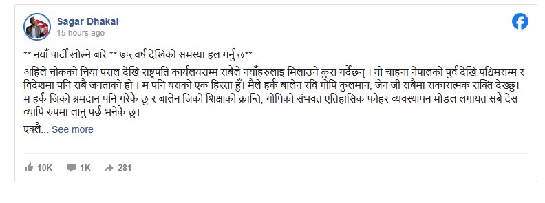ढकालले सामाजिक सञ्जाल फेसबुकमा स्ट्याटस लेख्दै सबैलाई समेट्ने प्रयासमा चुक भएको स्वीकार गर्दै त्यसमा सुधार प्रक्रिया अघि बढिरहेको बताएका हुन् । उनले लेखेका छन्, ‘सम्भवतः अझै सच्याउन मिल्ने अवस्था छ । हामी गल्ती नगर्ने होइन, गल्ती गर्छौं तर थाहा पाएपछि सुधार्छौं भनेर उत्तर दिनुपर्छ । आशा छ– कुलमान, रवि र बालेनले समानुपातिक सूचीमा जनताले उठाएको आवाज सुन्नुहुनेछ र सुधार गर्नु हुनेछ । मैले पनि सुन्ने ठाउँमा सुनाउने प्रयास गर्छु ।’