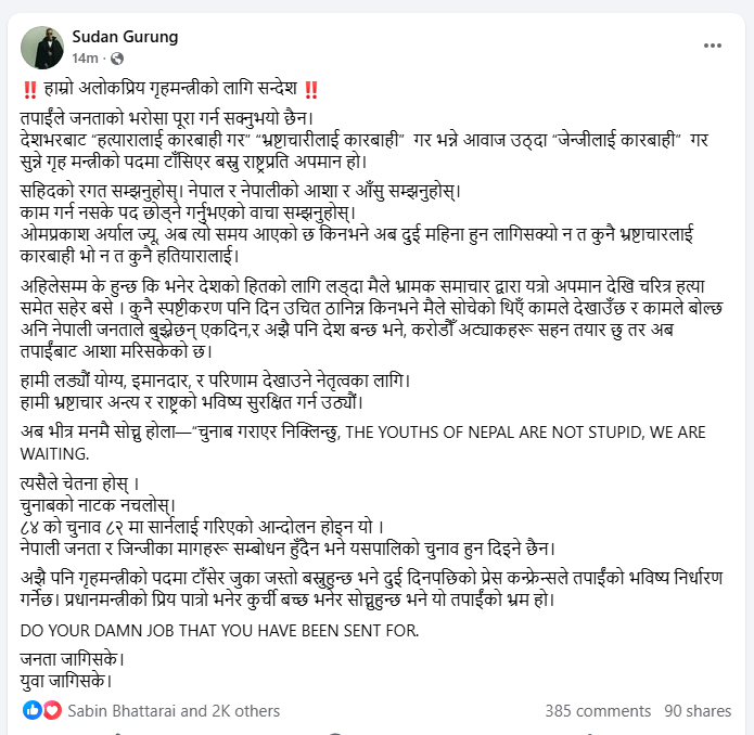 सामाजिक सञ्जालमार्फत ‘अलोकप्रिय गृहमन्त्रीका लागि सन्देश’ शीर्षकमा लेख्दै गुरुङले भनेका छन्, ‘शहीदको रगत सम्झनुहोस्, नेपाल र नेपालीको आशा र आँशु सम्झनुहोस् । काम गर्न नसके पद छोड्ने वाचा गर्नुभएको थियो—अब त्यो वाचा पूरा गर्नुहोस् ।’ उनका अनुसार दुई महिनाभन्दा बढी समय बितिसक्दा पनि आन्दोलनका क्रममा मारिएका युवाहरूका हत्यारा अझै पक्राउ नपरेकोले सरकारप्रति जनआस्था समाप्त हुँदै गएको छ ।